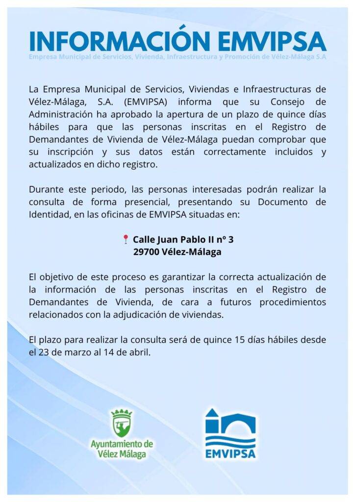EMVIPSA informa de la apertura de un plazo de 15 días hábiles para que las personas inscritas en el Registro de Demandantes de Vivienda de Vélez-Málaga puedan comprobar que sus datos están correctamente incluidos y actualizados.